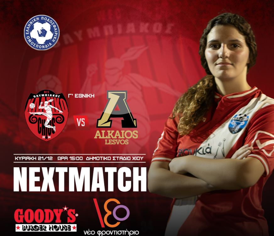 Για τον 7ο όμιλο της Γ’ Εθνικής ποδοσφαίρου γυναικών την Κυριακή 21/12 15:00 ο Ολυμπιακός Χίου αντιμετωπίζει τον ALKAIO Λέσβου στο Δημοτικό Στάδιο Χίου. Η ομάδα μας έχει 2 ισοπαλίες ενώ ο Αλκαίος έχει βαθμούς. Διαιτητές της αναμέτρησης Πετρίδης, Στουπάκης, Οικονομοπούλου Στα άλλα ματς Καλλόνη Λήμνος την ίδια ώρα ενώ στις 12:00 του Σαββάτου Πανσαμιακός- …