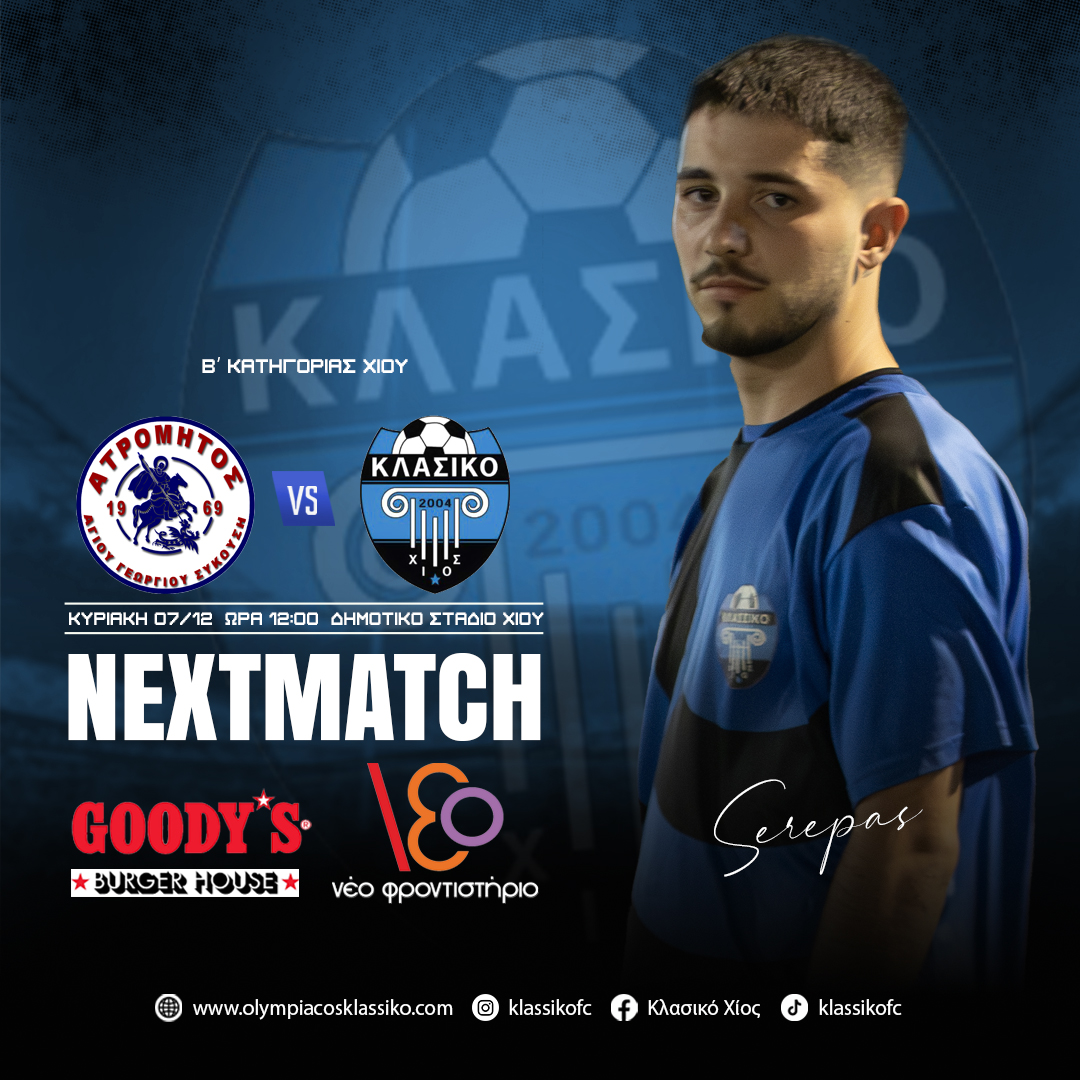 Κόντρα στον πρωτοπόρο Ατρόμητο Αγίου Γεωργίου Συκούση στο Δημοτικό Στάδιο Χίου για την B’ ΚΑΤΗΓΟΡΙΑ την Κυριακή 07/12 στις 12:00 η ανδρική ομάδα του Γιάννη Λύκου. Επίσης η Κ14 αγωνίζεται στα Θυμιανά την Κυριακή στις 17:00 με αντίπαλο τον Ατρόμητο/Άγιαξ