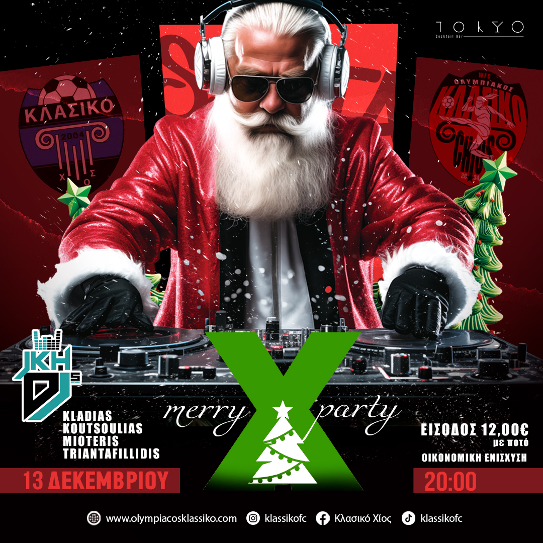 Merry Xmas Party του Ολυμπιακού/Κλασικό Χίος το Σάββατο 13 Δεκεμβρίου | 20:00 @Τokyo στο ΤΟΚΥΟ Είσοδος (οικονομική ενίσχυση): 12€ με ποτό Για τους ανήλικους ο Santa σερβίρει γάλα με cookies ή mocktails Music by JKHDJs