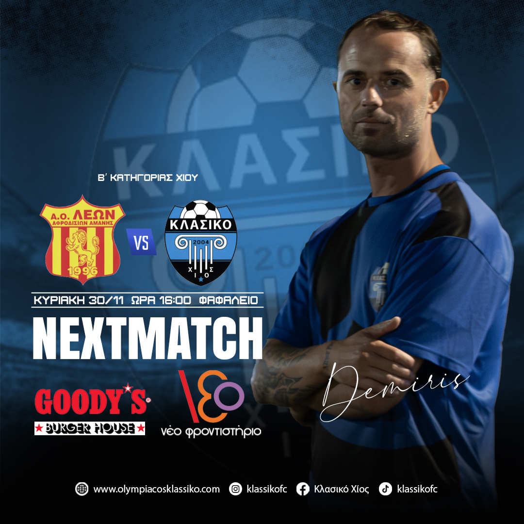 Με 3-0 επικράτησε ο Ολυμπιακός/Κλασικό Χίου του Λέων Αφροδισίων την Κυριακή το απόγευμα στο Φαφαλείο στάδιο. Τα γκολ της ομάδας μας σημείωσαν οι Αουρέλ, Ντέμι, Καλούδης. Σταθερά στην 3η θέση η ομάδα μας με 5 νίκες σε 7 ματς. Την Κυριακή το τελευταίο ματς για το 2025 με τον πρωτοπόρο Ατρόμητο. ΟΛΥΜΠΙΑΚΟΣ/ΚΛΑΣΙΚΟ ΧΙΟΥ: ΣΥΡΡΗΣ, ΒΑΣΙΛΑΚΗΣ, …